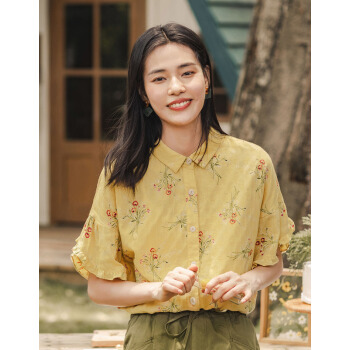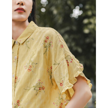 茵曼秋装新款素雅印花中袖衬衣翻领宽松显瘦木耳边袖口衬衫女 阳光黄 S |