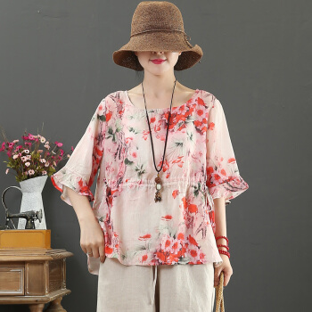 龙芝美 短袖衬衫女夏季新款棉麻女装文艺印花荷叶袖五分袖短款衬衣 L1-XJMC038-7133-黄色 L |