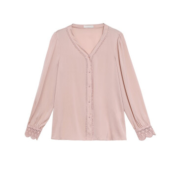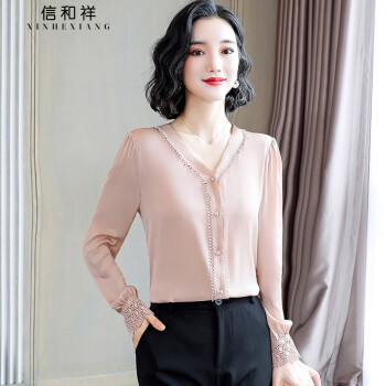 信和祥衬衫女夏秋季新款韩版上衣仿真丝时尚大码洋气V领雪纺缎面职业装衫打底小衫衬衣潮 皮粉色 M |