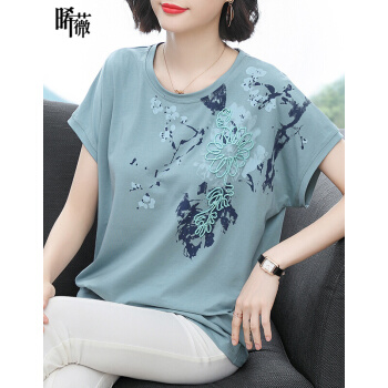 【精选好货】晞薇夏装新款年棉女装立体花朵拼接图案碎花短袖T恤女上衣大码中年妈妈半袖t桖夏 豆绿 M |