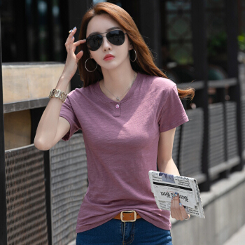 红粉宣言夏季新款百搭宽松竹节棉大码T恤女短袖 蓝色 L |