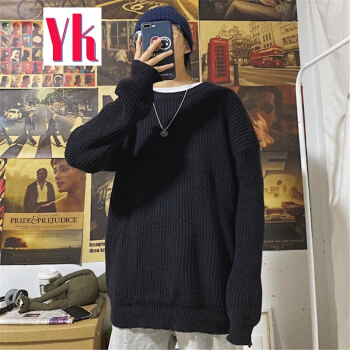 港风潮流ins慵懒风毛线衣情侣纯色圆领针织衫韩版宽松学生毛衣男 黑色 M |