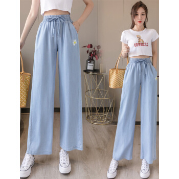 阅樱牛仔裤女冰丝 新款女裤夏松紧腰宽松大码休闲牛仔裤女垂感阔腿裤显瘦天丝裤子女薄款拖地裤子女 蓝色 L |