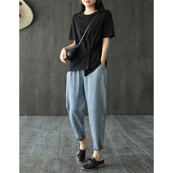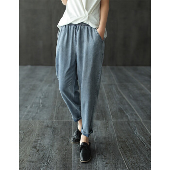 龙芝美 天丝牛仔裤女夏季新款复古文艺松紧腰宽松哈伦九分裤女 蓝色 请拍正确尺码 |