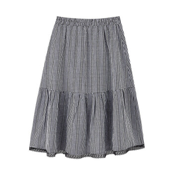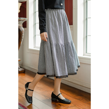 茵曼秋装新款松紧高腰A字中长款学院花边文艺复古格子半身裙【F1803571】 黑格 L |