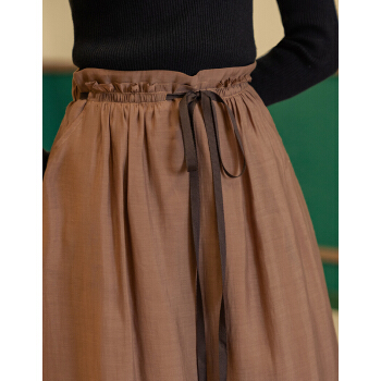 茵曼秋装新款时尚苞头中腰撞色系带半身中长裙棉质内衬文艺【F1803779】 浅咖啡 L |