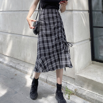 三裳高腰格子半身裙夏抽绳褶皱不规则a字裙显瘦一步包臀裙鱼尾裙中长 格子(棉麻) S |