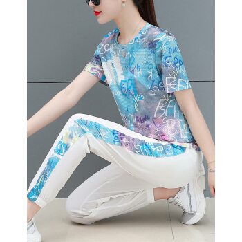 婪澈休闲裤女女装夏季新款宽松韩版潮流短袖长裤印花显瘦洋气两件套套装女 蓝色 请下正确尺码 |