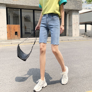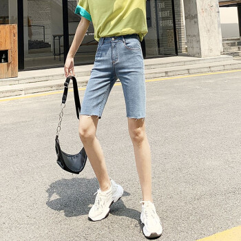 【品质好货】Hizze牛仔短裤女新款高腰显瘦休闲直筒裤夏季薄款紧身外穿五分骑行中裤 黑色 M |