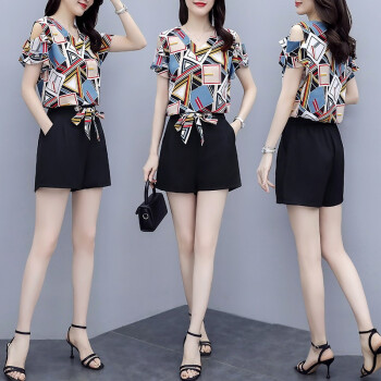 睡妍 短裤套装女夏装新款韩版休闲时尚女装大码显瘦时尚洋气印花短袖雪纺上衣短裤套装两件套女夏 图色 XL |