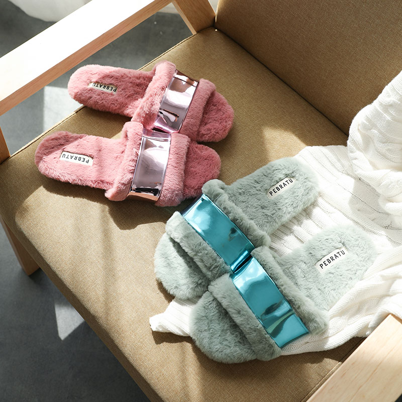 时尚亮片毛绒开口外穿毛拖鞋【短毛绒/浅绿】 |