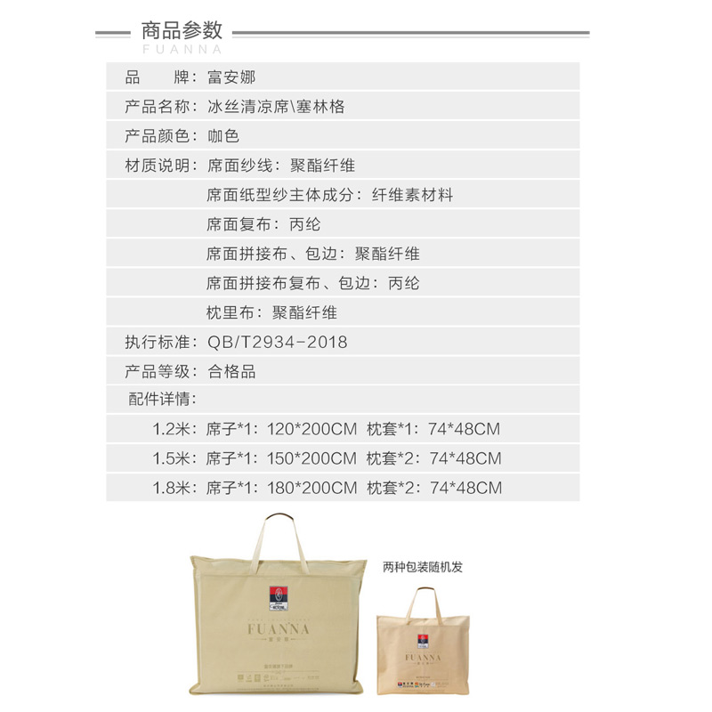 塞林格 冰丝清凉席三件套(凉席1件枕套2件)(适合1.8米床)【聚酯纤维+纤维素材料/咖啡】 |