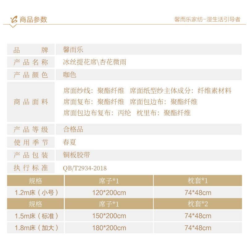 杏花微雨 冰丝提花席三件套(凉席1件枕套2件)(适合1.8米床)【聚酯纤维+纤维素材了/咖】 |