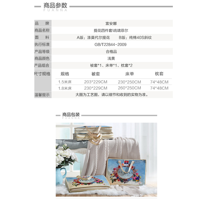 琉璃菲尔 床单四件套(被套1件床单1件枕套2件)(适合1.5米床)【涤莫代尔提花/浅黄】 |