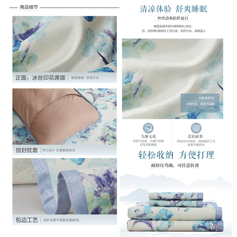 水漾江南 冰丝印花席床单款三件套(凉席1件枕套2件)(适合1.5-1.8米床)【聚酯纤维+纤维素材料/蓝】 |