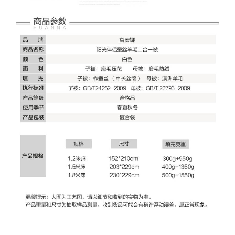 蚕丝羊毛二合一被(被芯1件)(适合1.8米床)【面料:聚酯纤维;填充:羊毛、蚕丝/白】 |