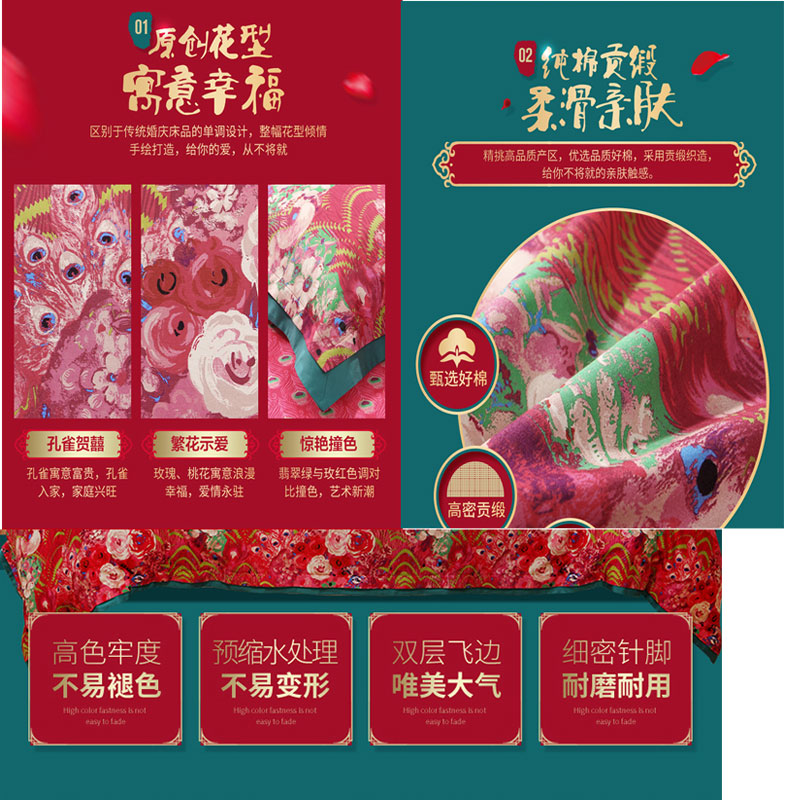 花舞盈歌 床单四件套(被套1件床单1件枕套2件)(适合1.5米床)【纯棉缎纹/红】 |