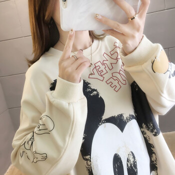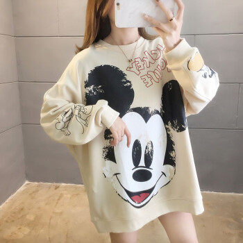 卡赫希卫衣女春秋季新款韩版慵懒风中长款米奇印花圆领长袖百搭休闲女学生上衣潮女5005 杏色 请拍正确尺码 |