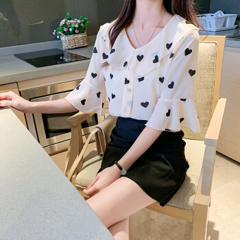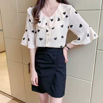 夏新款雪纺衫T恤女波点印花娃娃舒适透气领洋气荷叶边上衣胖妹妹女装 杏色 M |
