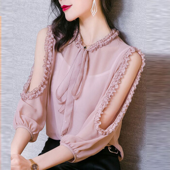 雪纺衬衫女装夏季新款韩版时尚系带洋气木耳边宽松百搭上衣设计感小众衬衣女 粉红色 L |