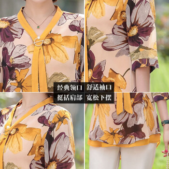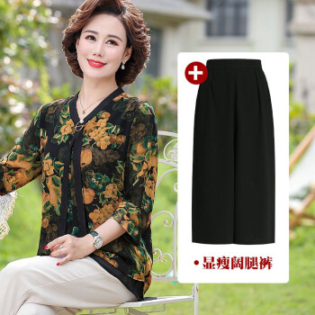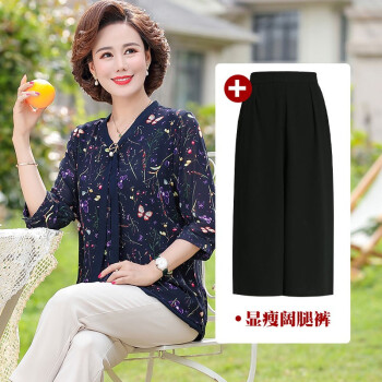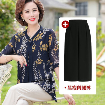 俪缨中老年女装夏装休闲套装女短袖上衣新款洋气4050岁中年妇女雪纺衫两件套阔太太妈妈装小衫 1号色+阔腿裤 2XL(建议105-120斤穿) |
