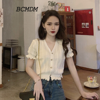 BCMDM 香港潮牌露脐短款针织衫女 夏季新款气质复古V领镂空收腰木耳边针织衫纯色短袖上衣 白色 M |
