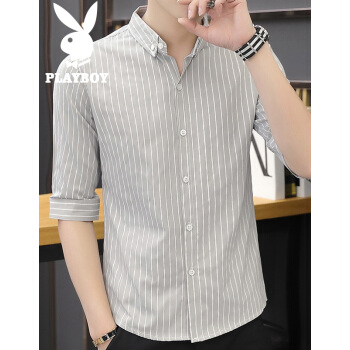 短袖衬衫男夏季新品透气韩版条纹衬衣男装青年薄款宽松休闲外套五分袖上衣服 6023灰色 M |