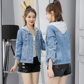 韩诗茵牛仔外套女春秋新款长袖韩版宽松短款休闲连帽牛仔上衣百搭夹克 蓝色 L |