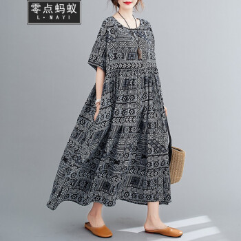 零点蚂蚁加肥加大码女装胖mm夏装洋气时尚休闲宽松遮肉连衣裙长裙胖人女装长款裙子 图片色 均码【130-220斤】 |