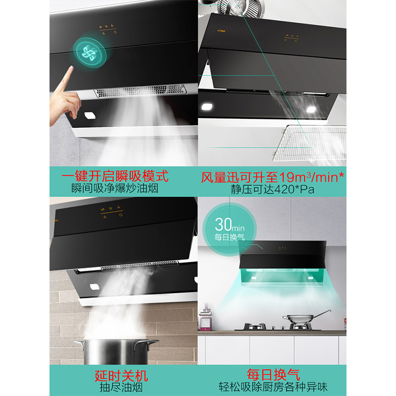 JQC5 一键瞬吸 19m3/min*大风量 30min换新空气* 侧吸抽油烟机 【不锈钢+钢化玻璃/黑色】 |