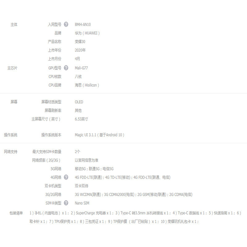 荣耀30 5G手机 全网通版8GB+128GB【其他/B-1】 |