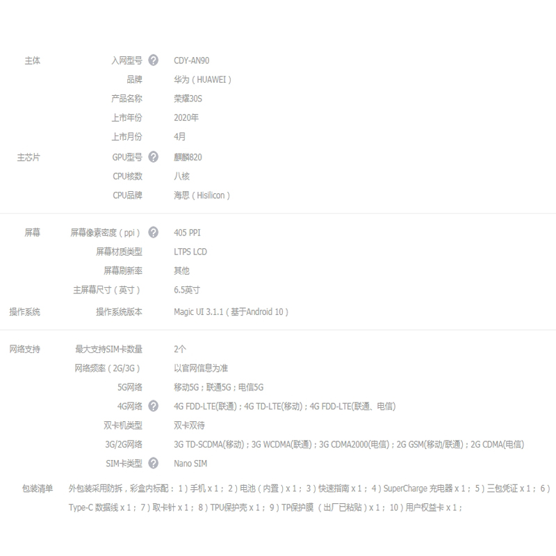 华为荣耀30S 双模5G 麒麟820 5G SOC芯片 8GB+128GB 蝶羽白【其他/蝶羽白】 |