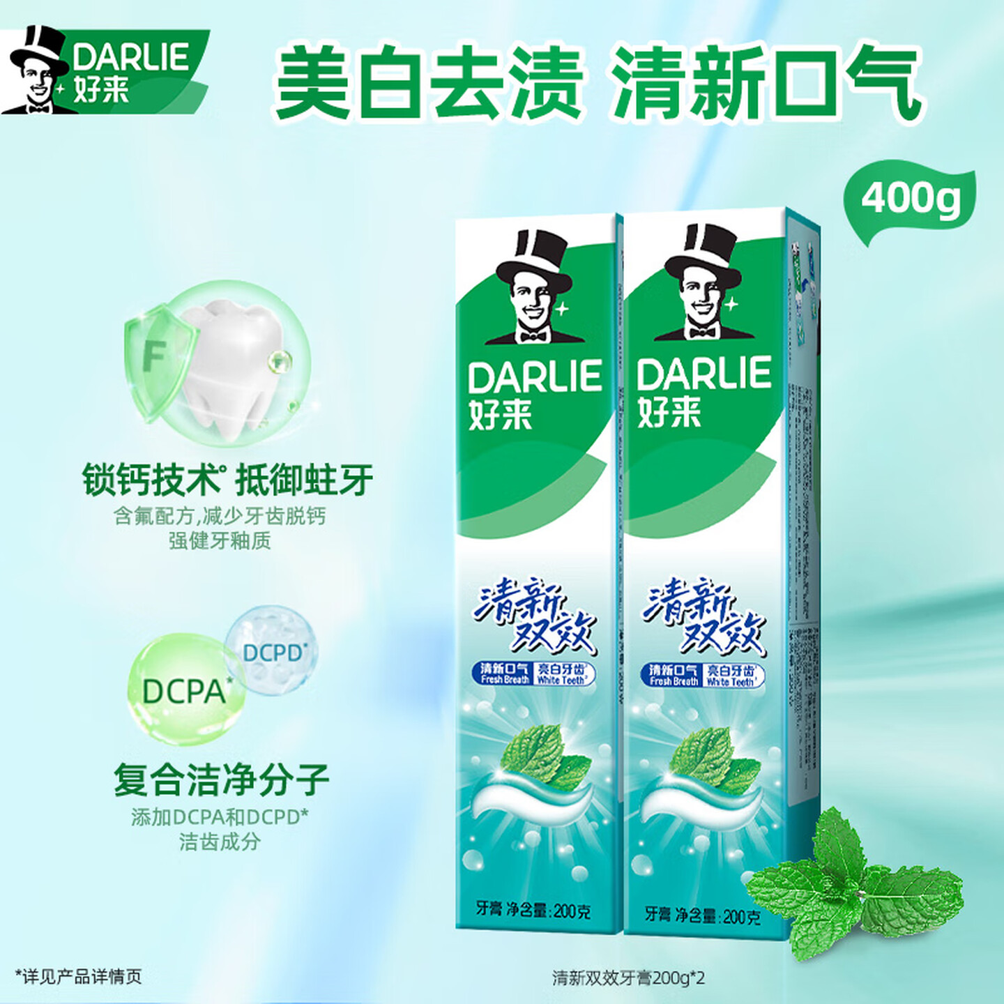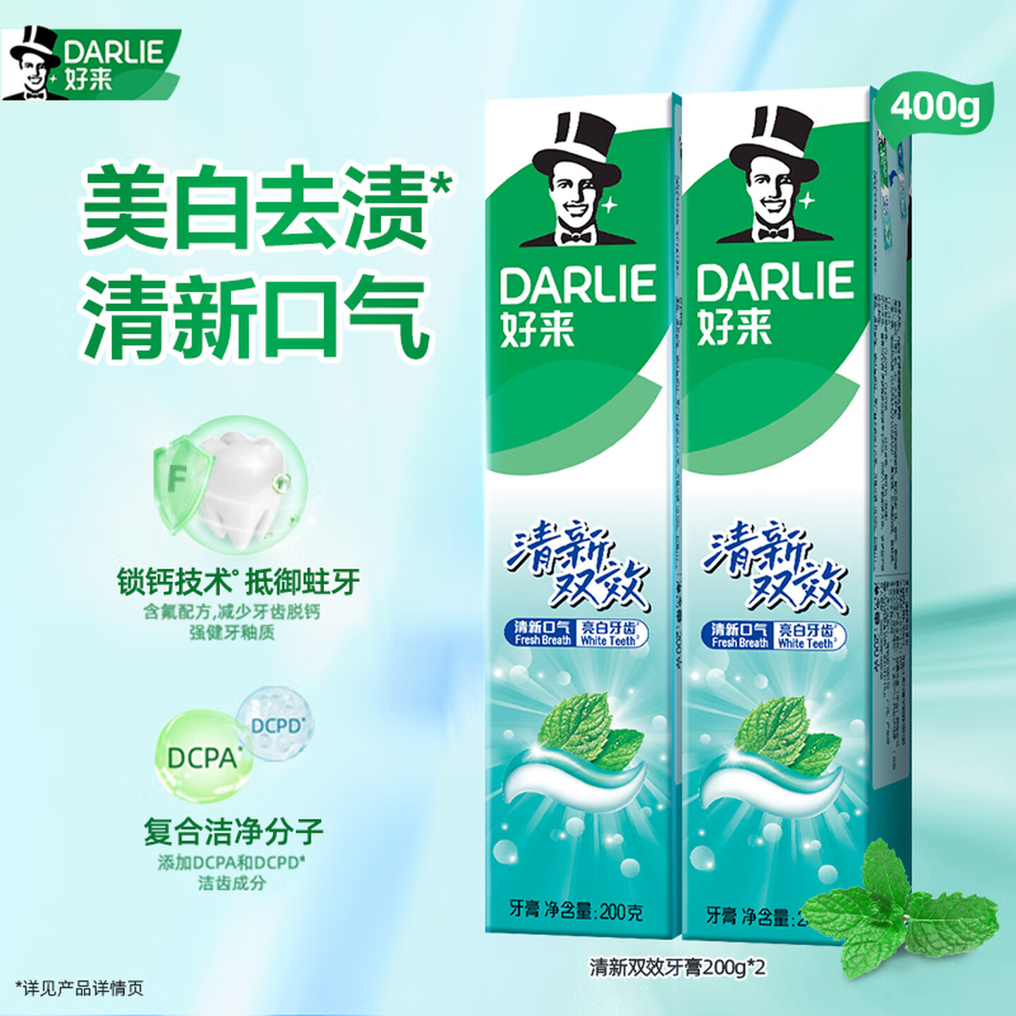 DARLIE好来(原黑人)清新双效牙膏去口气去渍固齿2支400g |