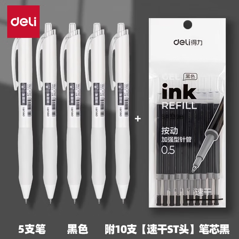 得力按动黑色0.5mm中性笔5支+10芯 |
